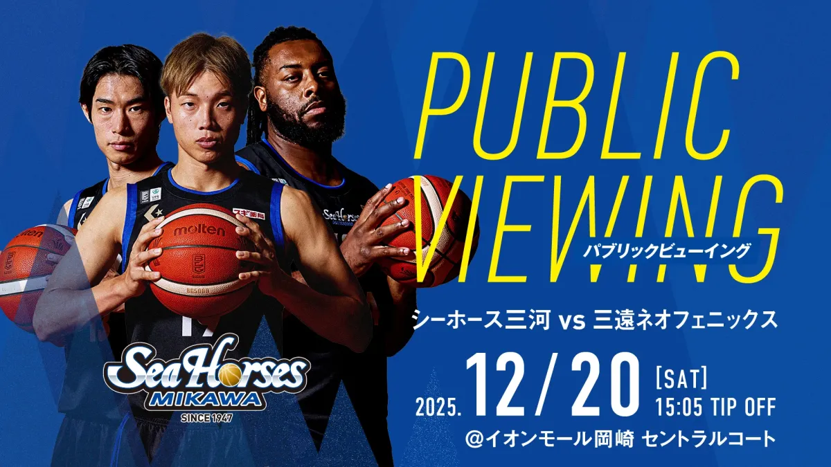 2025年12月20日(土)、愛知県岡崎市にあるイオンモール岡崎の1Fセントラルコートで、シーホース三河のパブリックビューイングが開催されることが発表されました。このイベントは、ファンが一堂に会して選手たちへ応援を送る貴重な機会です。イベントの開始は14:55と予定されており、試合終了まで盛り上がることが期待されています。