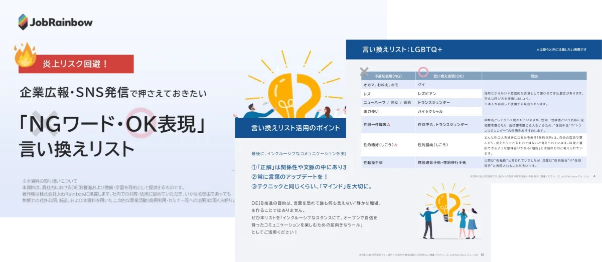 株式会社JobRainbowは、企業におけるコミュニケーションをより包摂的にすることを目指し、無料で「NGワード・OK表現」言い換えガイドを公開しました。この資料は、日常的な会話やビジネスシーンにおける発信が、意図せず誰かを傷つけないようにするためのツールです。