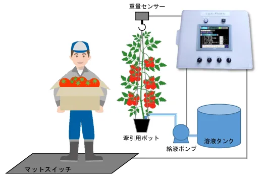 自動潅水システム「うるおい力持ち」は、現代の農業における技術革新を象徴しています。このシステムは、多様なセンサーを駆使して、植物が必要とする水分を的確に把握し、最適な水やりを実現しています。特に、重量センサーを使用して、栽培中のトマトの重さを常時計測し、そのデータを基に潅水を制御。これにより、植物が元気に育つための確実な環境を提供しています。