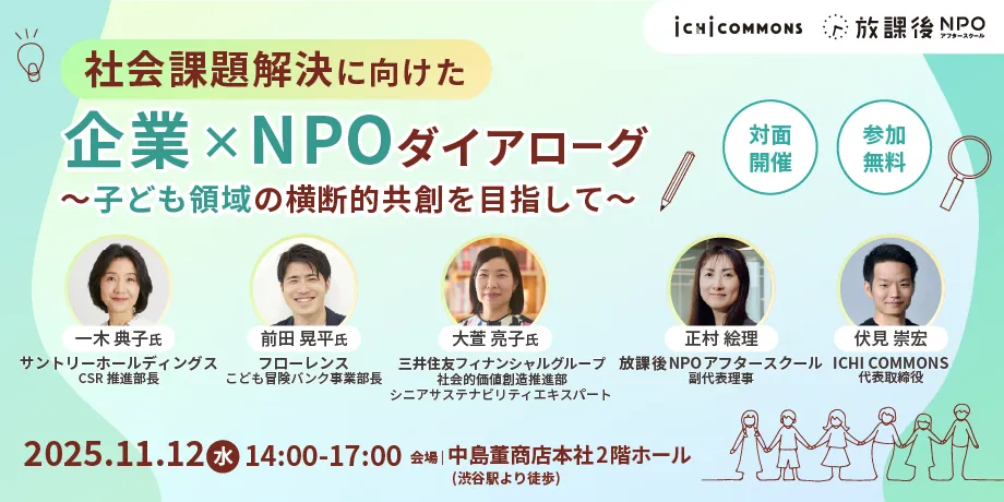 社会課題に対応するためには、企業とNPOが力を合わせることが重要です。11月12日、東京渋谷区の株式会社中島董商店本社で、「社会課題解決に向けた企業×NPOダイアローグ~子ども領域の横断的共創を目指して~」が開催されます。主催は、ICHI COMMONS株式会社と放課後NPOアフタースクール。