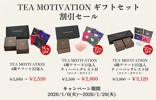さらに、2026年1月8日から2月1日まで、バレンタイン用の新商品「TEA MOTIVATION バレンタインチョコレートセット」を特別価格で販売。8包入りが通常1,800円のところ特別価格の1,620円、11包入りは通常2,300円が2,070円に。