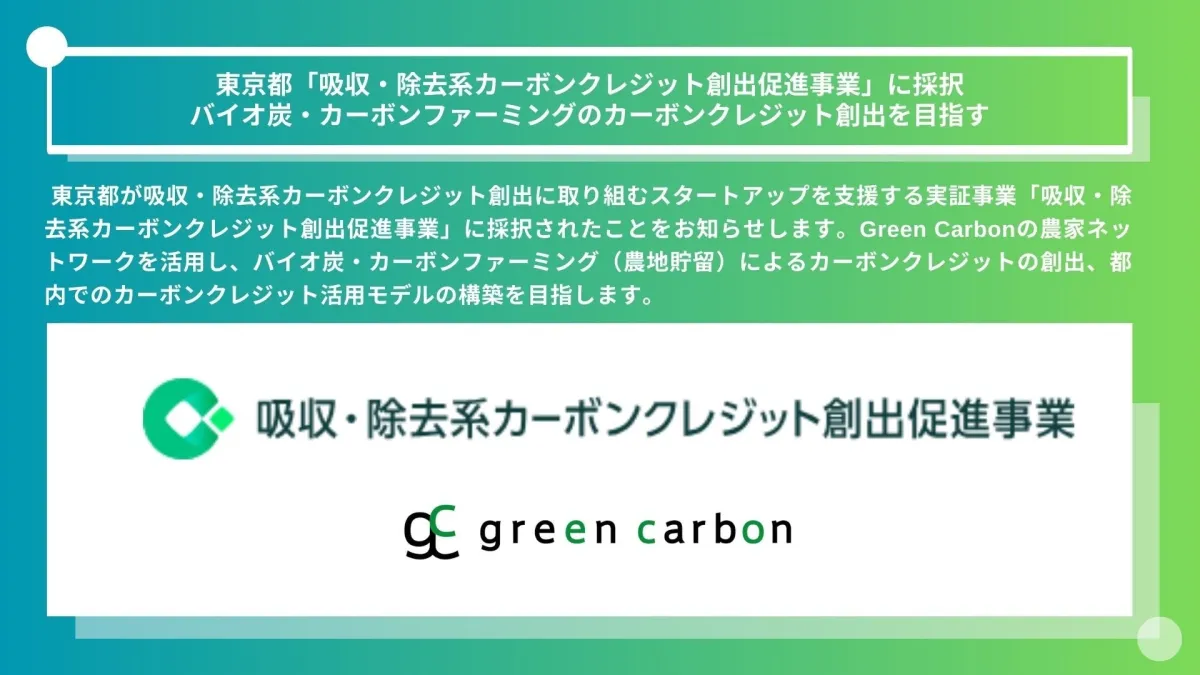 Green Carbon株式会社(代表取締役:大北潤)は、東京都が推進する「吸収・除去系カーボンクレジット創出促進事業」に採択されたことを発表しました。この事業は、カーボンファーミングやバイオ炭を利用して、CO2の吸収・除去を目指すものです。東京都が掲げる「ゼロエミッション東京」の実現に向けて、さらに一歩進んだ取り組みと言えるでしょう。