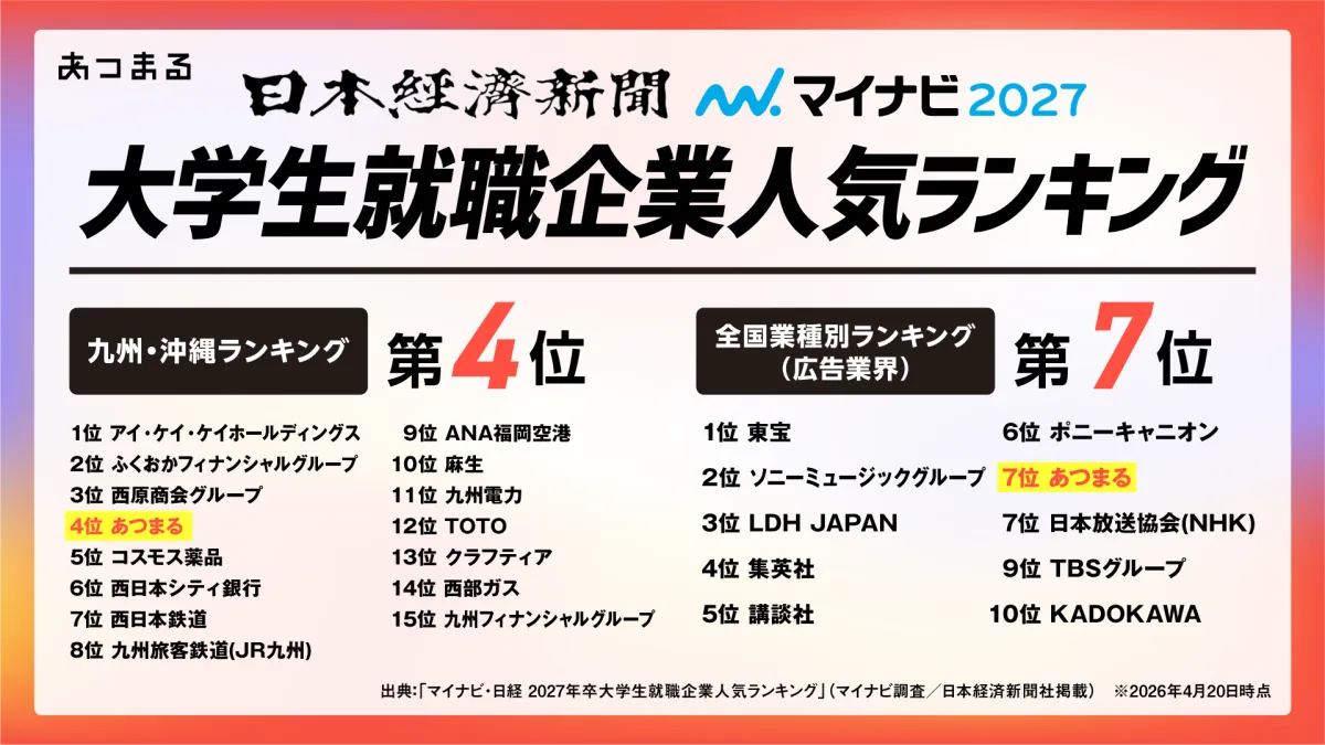 九州・沖縄ランキングで4位、業種別では広告分野で7位、全国総合ランキングの文系部門では76位に選ばれました。特に注目すべき点は、従業員74名という規模ながら、これほどの高評価を得たことです。大手企業が多く名を連ねる中、あつまるは大きな存在感を示しました。例えば、同じ広告業界では、日本放送協会(NHK)やKADOKAWAなどの大企業がランクインしている中で、あつまるの方が目立つ結果となりました。