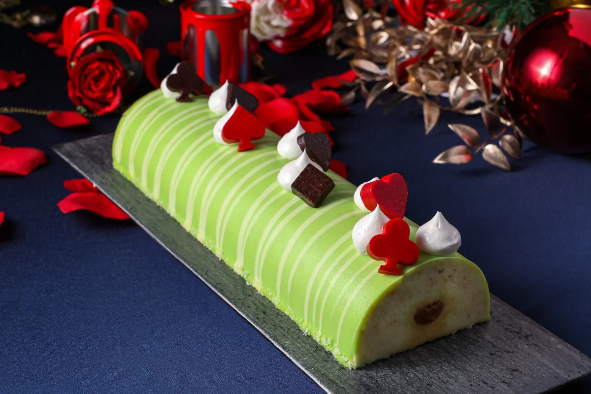 ビュッフェには、約20種類のクリスマススイーツが用意されます。中でもおすすめの一品は、青りんごのムースとキャラメルの層で、慌てて庭の白いバラを塗り替えるトランプ兵を模した「てんてこまいのトランプ兵」です。このスイーツは見た目も楽しく、食べる楽しみが広がります。他にも、木苺のジャムを包み込んだ赤色のチョコレートムース「ハートの女王のコレクション」や、しっとりとしたレッドベルベットケーキとクリームチーズフロスティングを重ねた「アリスが飾るクリスマスツリー」が人気です。