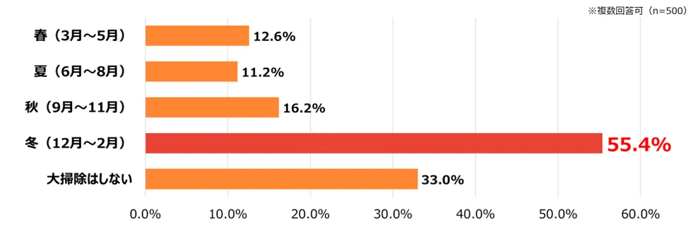 年末年始に実施するという習慣が根強く、調査では55.4%の人々が「冬(12月〜2月)」を選びました。これに対し、「秋(9月〜11月)」や「春(3月〜5月)」は少数派となり、最も多い回答は年末に大掃除をすることが確認されました。さらに、約6割の人々が「年に1回」または「年に2回」大掃除を行っているという結果が出ましたが、1/3の人は実施しないと答えています。