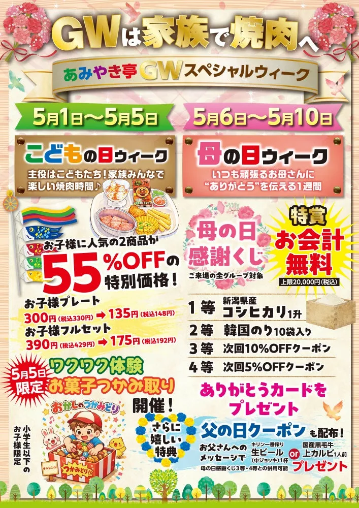 今年のゴールデンウィーク、あみやき亭では特別な企画が盛りだくさんです。子どもが喜ぶ「こどもの日ウィーク」とお母さんへの感謝を表す「母の日ウィーク」の2つのイベントが実施されます。