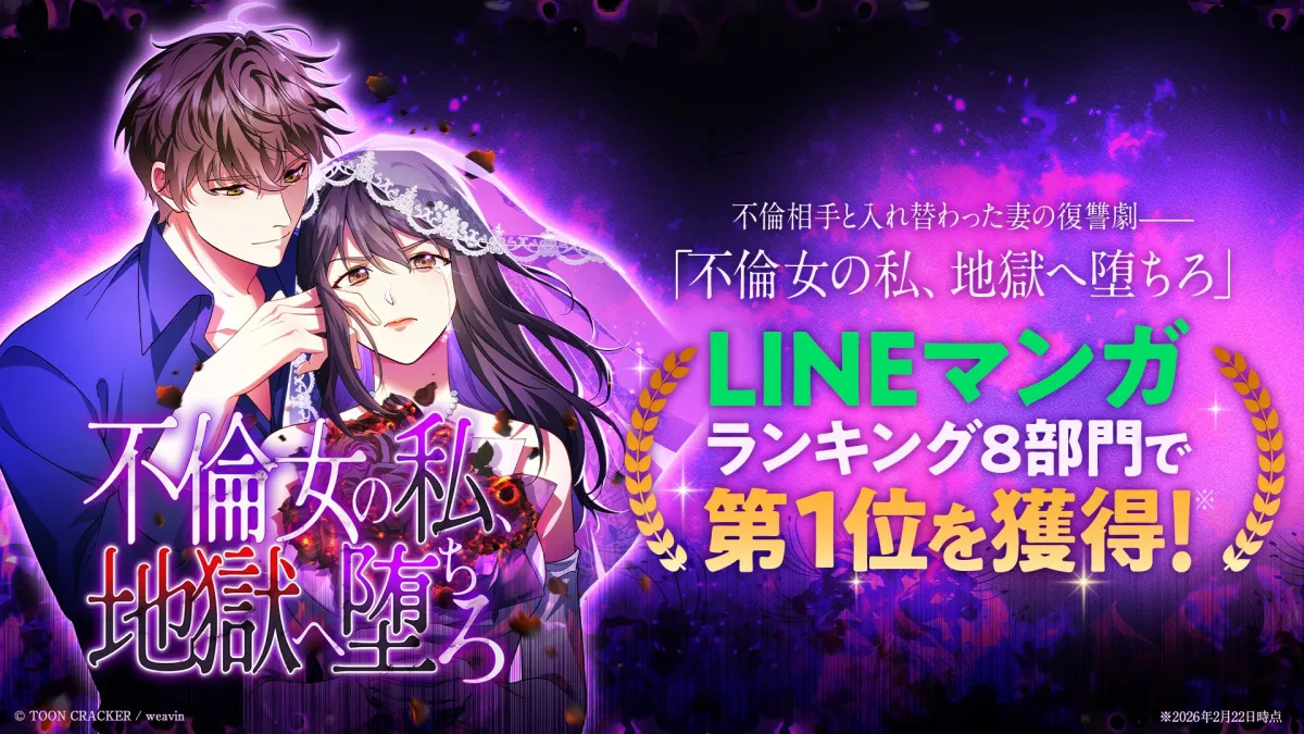 2023年2月22日、株式会社トゥーンクラッカーが手掛けるオリジナル縦読み漫画『不倫女の私、地獄へ堕ちろ』が、LINE Digital Frontierが運営するLINEマンガにて配信を開始しました。この作品は女性の復讐劇を描いたストーリーで、リリース初日にして以下の8部門で第1位を獲得しました。