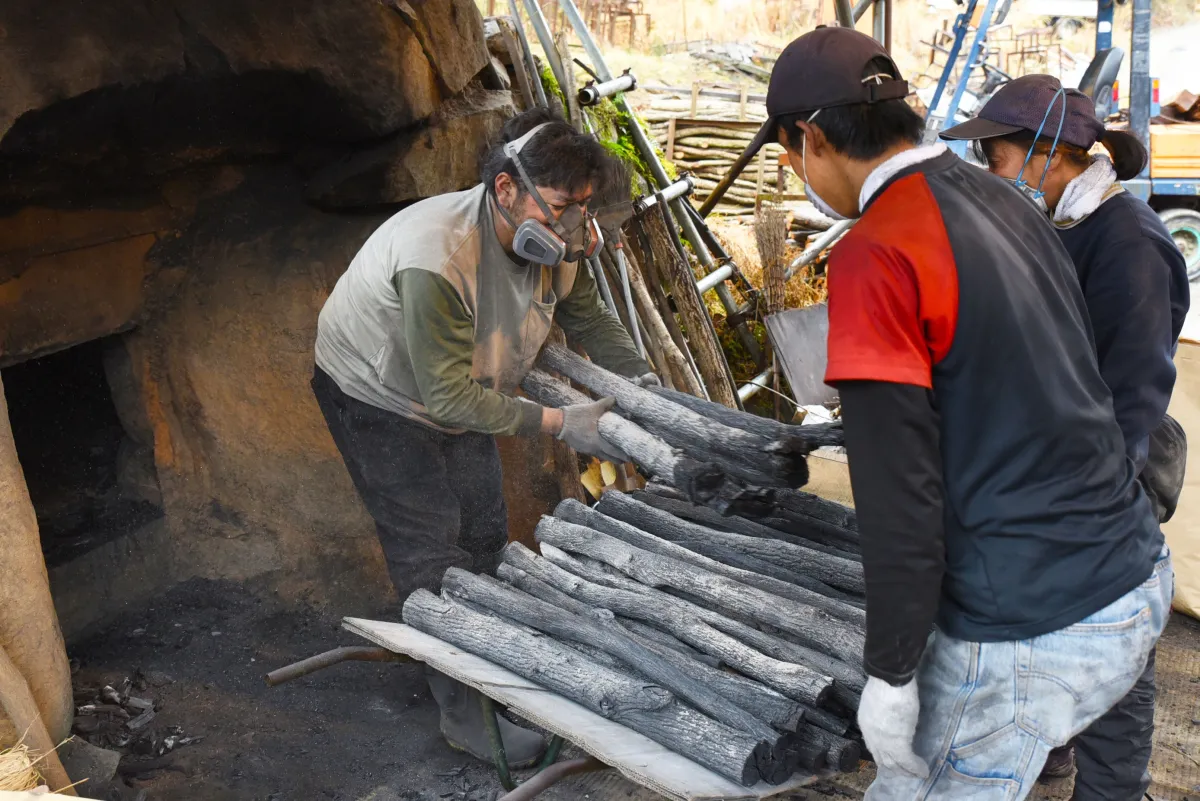 窯出し作業は、朝7時ごろから始まります。窯の中の温度は100~120度に達し、一度の作業は約15分程度しかできません。高温の中での作業は厳しく、焼き上がった炭を外に運び出す工程を終えた後は、外でしっかりと体を休めます。この作業は5月中旬頃まで続く予定です。