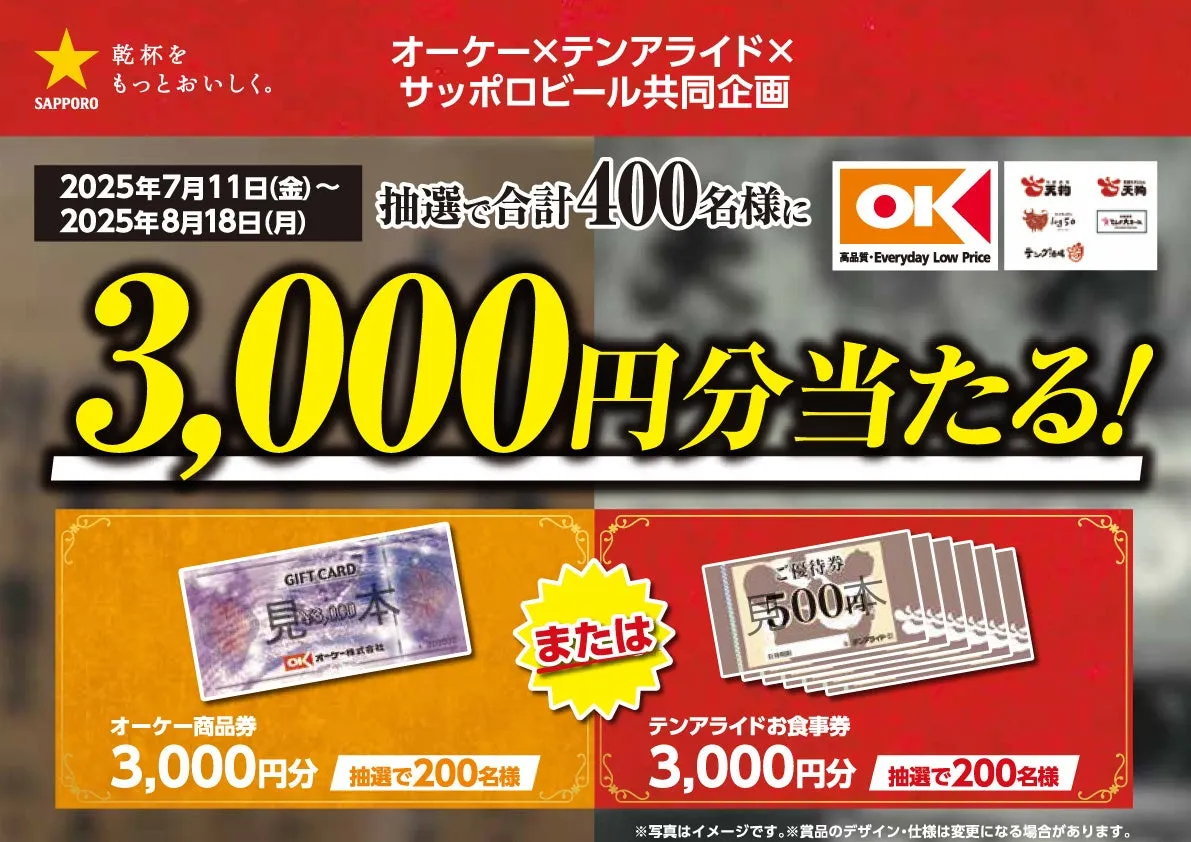 抽選で、「テンアライドお食事券3,000円分」と「オーケー商品券3,000円分」をそれぞれ200名様(合計400名様)にプレゼントします。夏の思い出を作る素敵なチャンスですね。