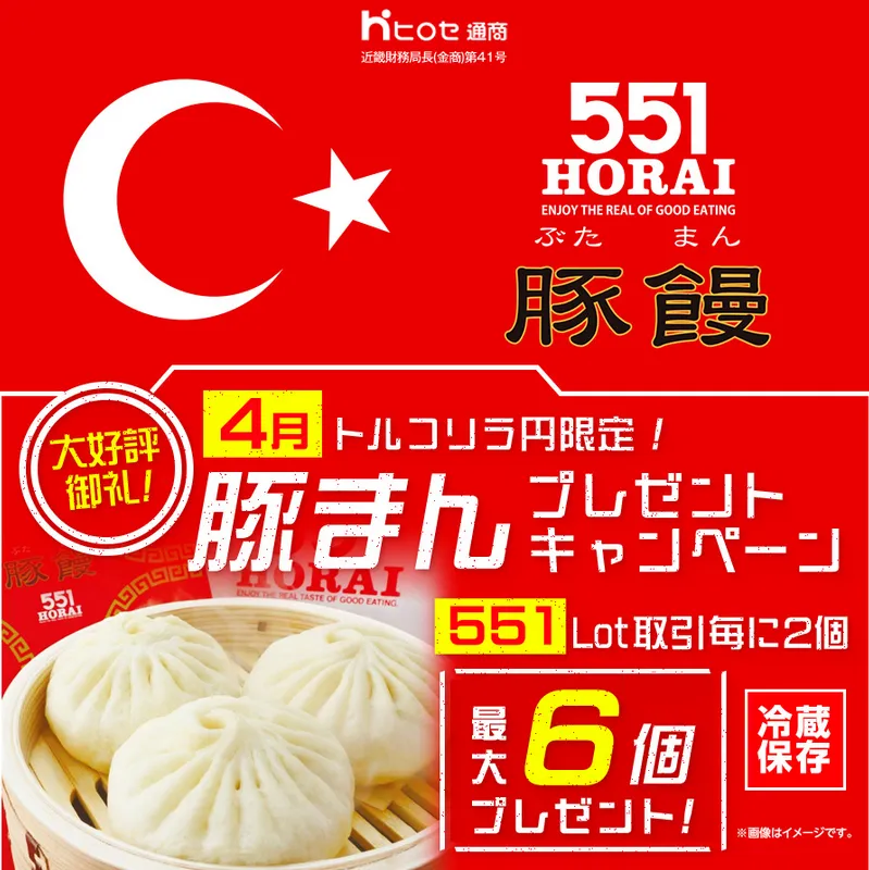 ヒロセ通商株式会社が提供する「LION FX」では、2026年4月1日から5月1日までの期間で、「LION FXトルコリラ円限定 551Lot取引で豚まんプレゼントキャンペーン」が実施されます。このキャンペーンでは、トルコリラ円で551Lot以上の取引を行ったお客様に、551蓬莱豚まんをプレゼントします。