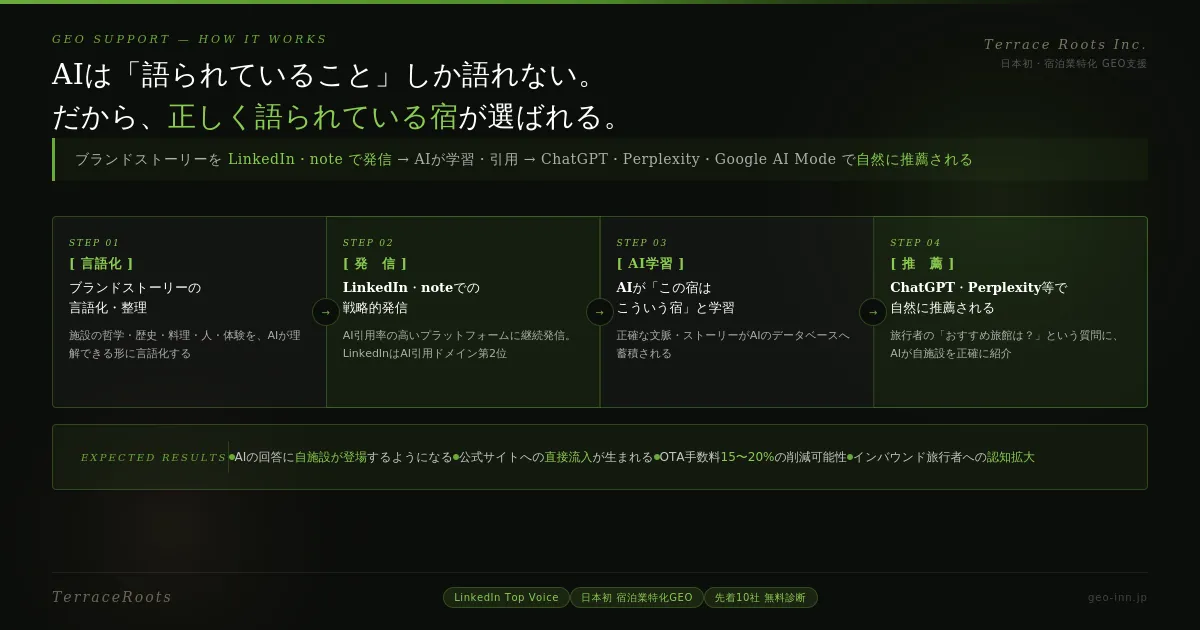 Terrace Rootsの提案は、キーワードを詰め込むことではなく、宿泊施設の「ブランドストーリー」を言語化し、AIが理解できる形で発信することです。これによって、旅行者が質問したときにAIが施設を正確に紹介できるようになります。以下のステップでGEOサポートを進行します。