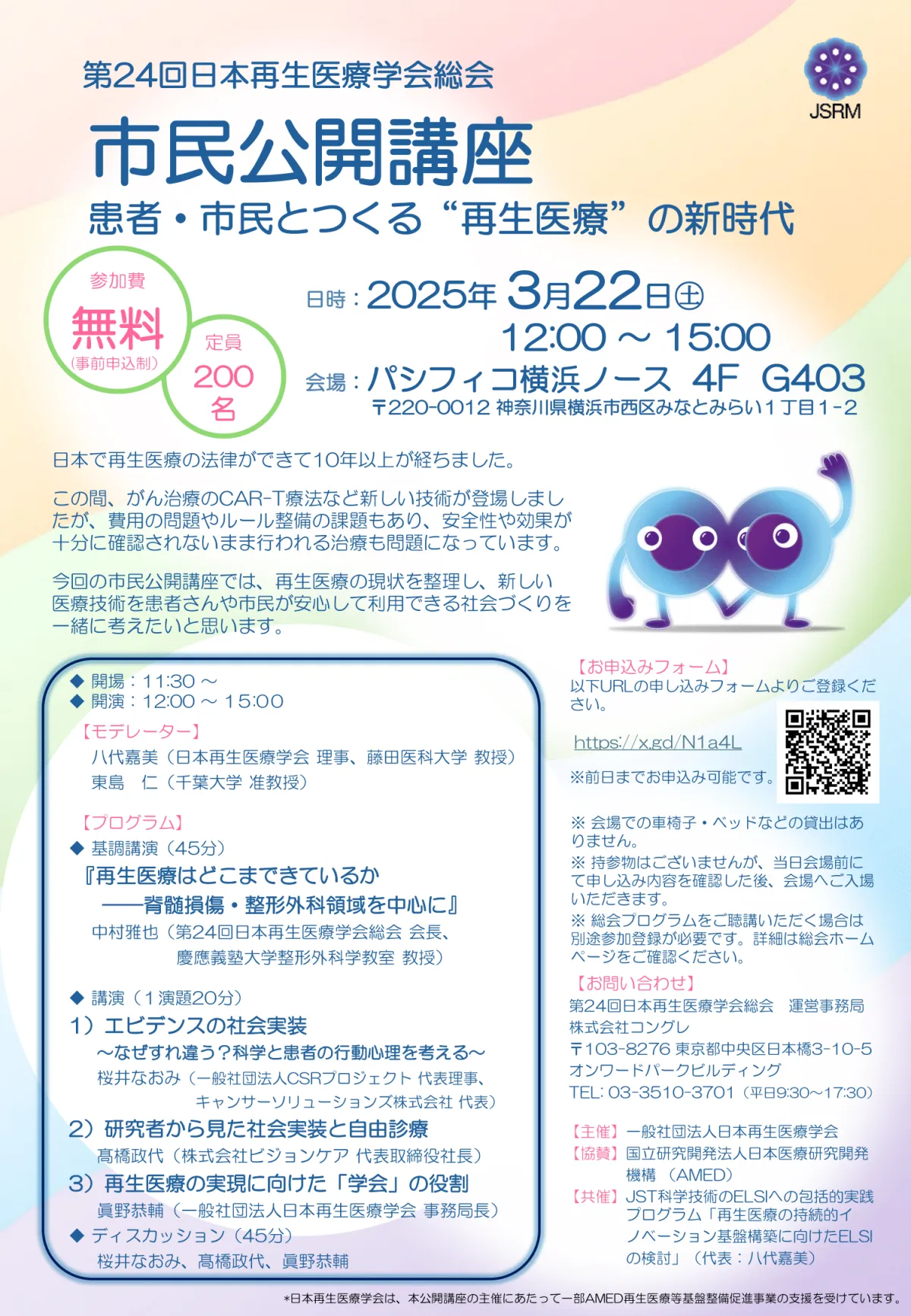 この市民公開講座は再生医療に興味を持つ方にとって、とても貴重な情報を得る機会です。最新の医療情報を知り、治療に対する理解を深める良いチャンスをお見逃しなく!