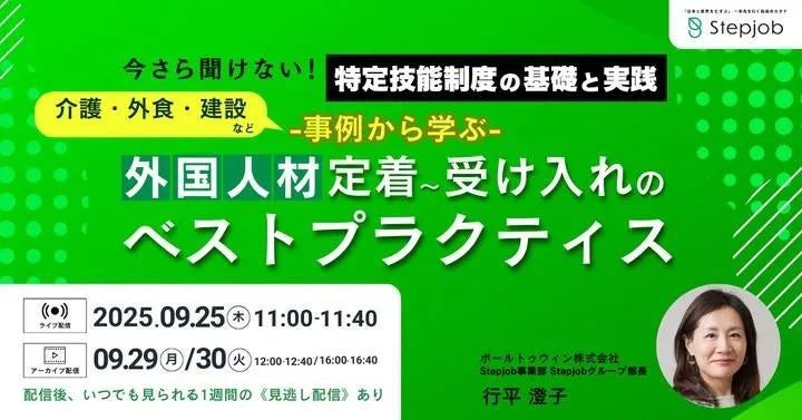 ポールトゥウィン株式会社は、2025年9月25日にウェビナー「今さら聞けない特定技能制度の基礎と実践」を開催します。本ウェビナーは、人材不足が深刻化する中で、特定技能制度を活用して外国人材を採用し、定着させるためのヒントを提供します。