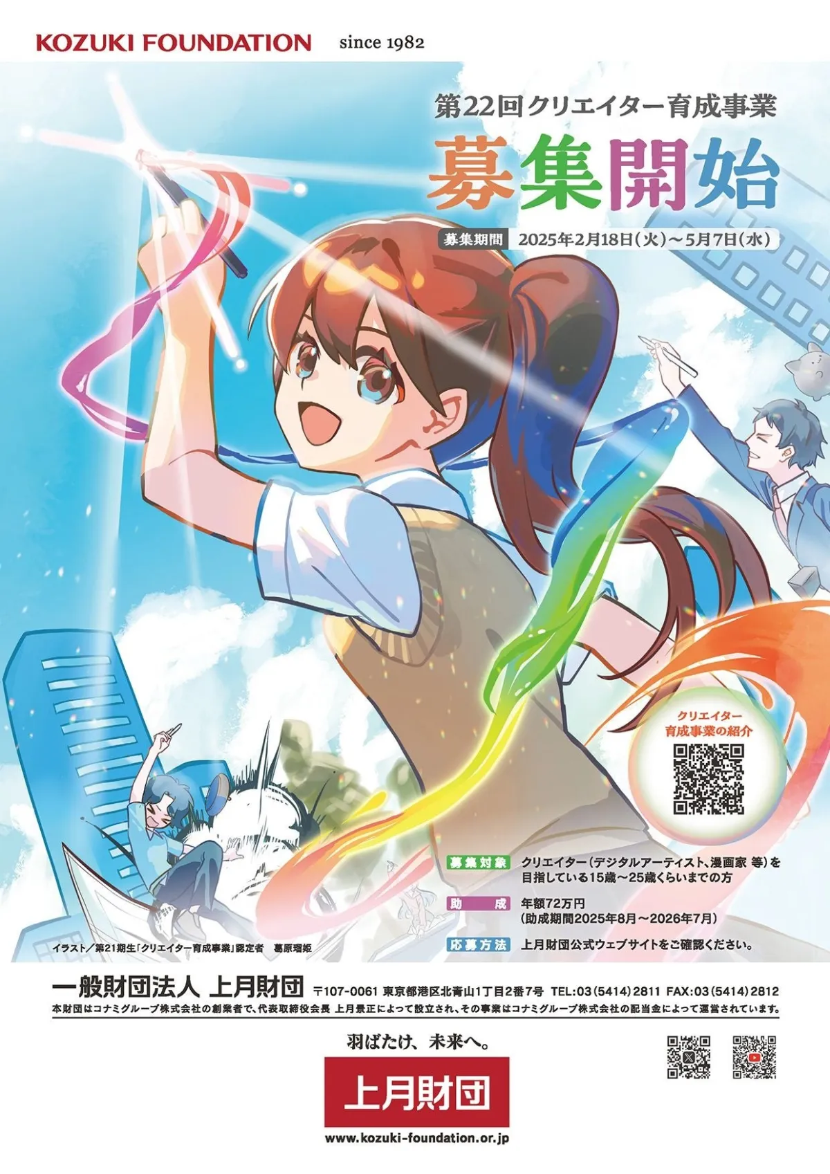 上月財団は、創立者である上月景正氏が1982年に設立した法人で、40年以上にわたりスポーツや教育、文化の振興に貢献してきました。今回はその一環として、20回目を超える「クリエイター育成事業」を受けるクリエイターを対象に、2025年2月18日より助成対象者の募集を開始します。このプログラムは、デジタルアーティストやイラストレーター、漫画家などを目指す15歳から25歳までの若者を対象とし、年額72万円の助成金を提供します。これは昨年度からの増額であり、より多くの才能を支援する姿勢が見られます。