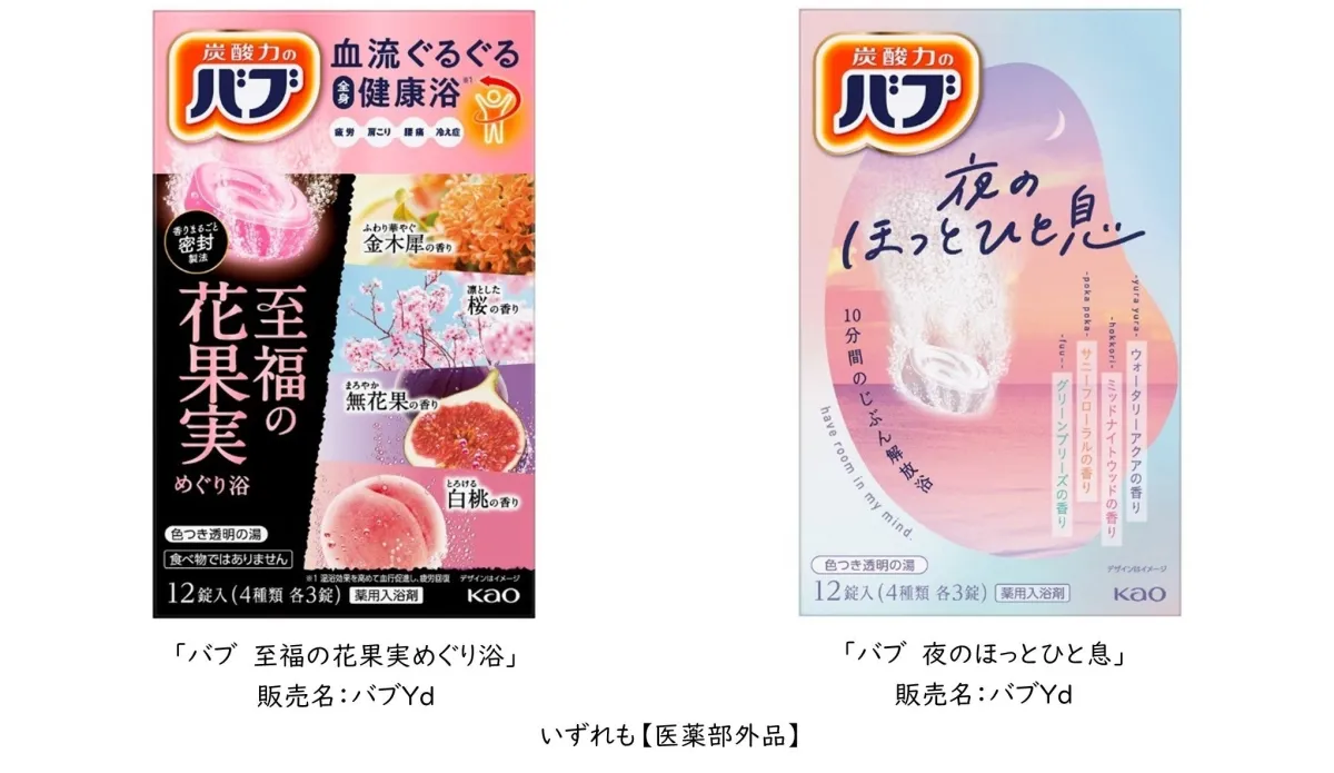 花王の「バブ」ブランドは、1983年の誕生以来、多くの人々に愛されてきました。入浴剤市場のパイオニアとして、炭酸ガスの力を活用した製品を展開し、長年にわたり多くの人々のバスタイムを豊かにしています。今回、2025年9月27日に新たに発表されるのは、香りに特化したアソートシリーズ「バブ至福の花果実めぐり浴」と「バブ夜のほっとひと息」です。