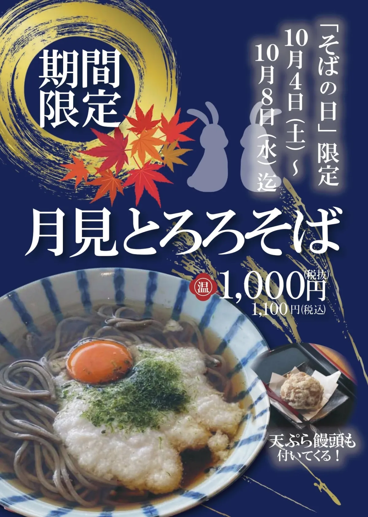 そばの日を記念し、10月4日から8日までの特別期間限定メニュー「月見とろろそば」を楽しむことができます。お月見の季節にぴったりなこの一品は、シンプルながらも深い味わいが魅力です。