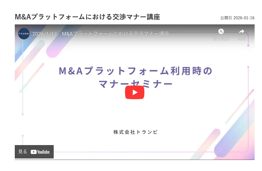 さらに、TRANBIは2026年1月16日(金)に「M&A交渉マナー講座」というオンラインセミナーを開催します。このセミナーでは、実際に交渉で役に立つ情報やトラブル事例、ユーザーから寄せられたクレームなどについて解説し、より良いコミュニケーションを促進します。アーカイブ動画も無料で視聴可能です。
