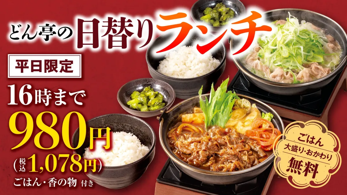 新たに展開される日替わりランチは、どん亭ならではの鍋仕立てにこだわった内容。ご飯と香の物がついたセットメニューは、食べごたえのあるスタイルで、もちろんご飯はお替り自由!このようなサービスによって、手軽に豊かな食事を楽しめるのが魅力です。昼食時の限られた時間の中で、心も体も癒される体験を提供します。