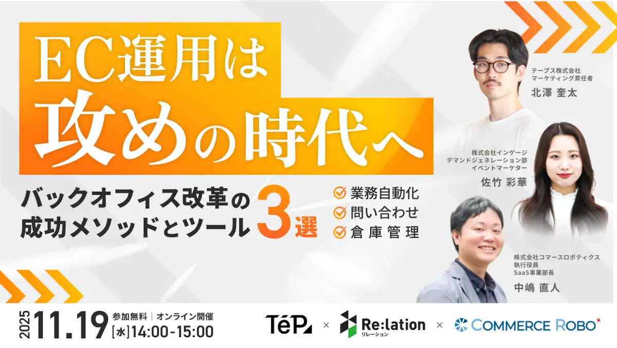 2025年11月19日に、顧客対応クラウド『Re:lation』を提供する株式会社インゲージが主催するウェビナー『EC運用は『攻め』の時代へ!バックオフィス改革の成功メソッドとツール3選』がオンラインで開催されます。
