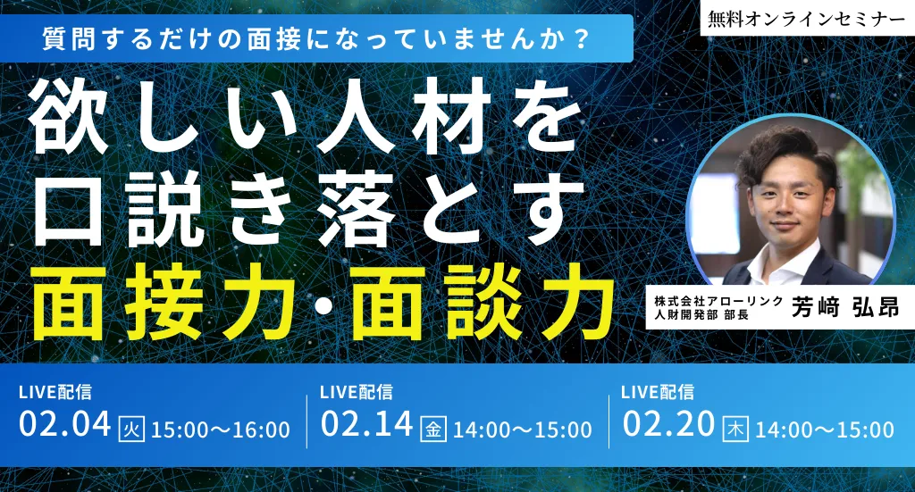 企業の採用において、面接は非常に重要な要素です。しかし、従来の「見極めるだけの面接」では、特に中小企業や知名度の低い業界では効果的な人材を得ることが難しくなっています。これを解決するために、株式会社アローリンクが主催する無料セミナー「質問するだけの面接になっていませんか?」が開催されます。このセミナーでは、採用のプロである芳﨑弘昂氏が、求める人材を引き寄せるための面接力と面談力について解説します。