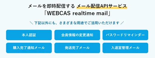 「WEBCAS realtime mail」はお客様のシステムと連携し、ユーザーのアクションやデータの更新に基づいてリアルタイムでメールを配信します。これにより、例えば、会員管理システムとの連携による「登録確認メール」や、ECサイトでの購入完了通知、さらにはカードリーダーと連携した「入退館通知メール」など、様々なシナリオで顧客に対し迅速なメール配信が実現します。