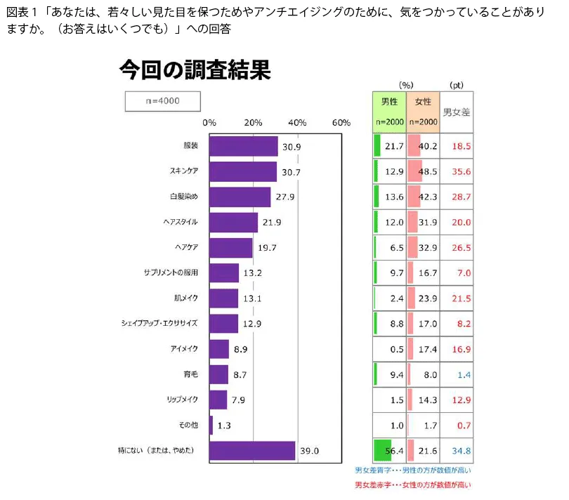 調査の結果、「若々しい見た目を保つためやアンチエイジングのために気を使っていること」について尋ねたところ、「白髪染め」と回答した人は27.9%に達しました。これは2019年に行った同様の調査の24.4%から顕著な増加となっています。また、「服装」に気をかける人も増え、今回の調査では30.9%が服装に注意を払っていると回答しています。注目すべきは、かつて「特にない」とした人の割合が46.8%から39.0%へと減少していることです。全体的に、自己意識や外見に対する関心が向上していることがうかがえます。