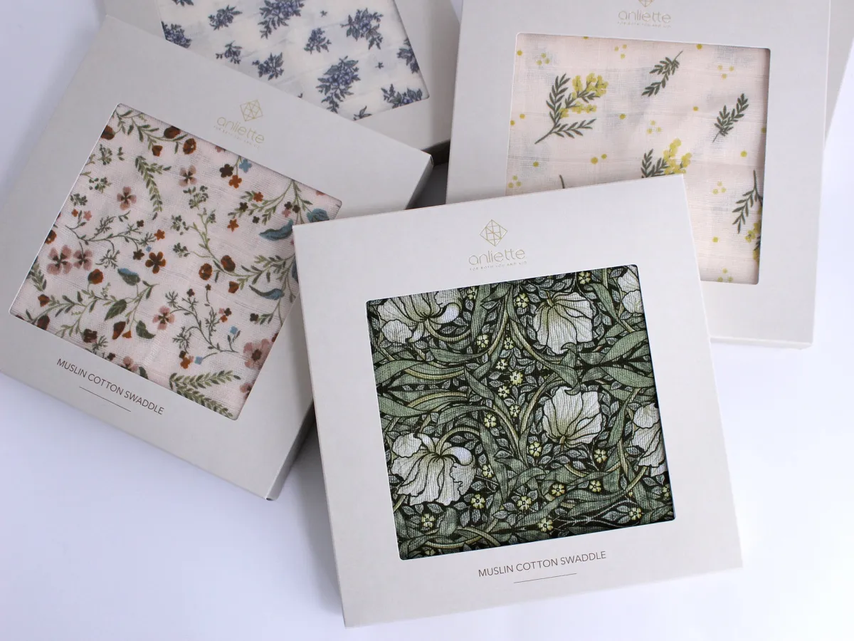 「花束スワドル」シリーズでは、Instagramの人気投票を通じて選ばれた5つのデザインを展開しています。ウィリアム・モリスのクラシックなデザインや、優しい印象の小花柄、控えめな色調が特徴のものなど、シンプルでありながらも魅力的なラインナップが揃っています。