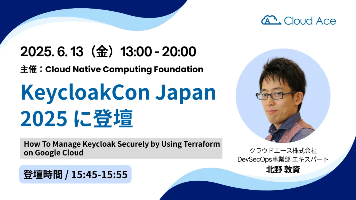 クラウドエースの登壇者である北野敦資(DevSecOps事業部 エキスパート)は、「How To Manage Keycloak Securely by Using Terraform on Google Cloud」というセッションを通じて、Google Cloud上におけるKeycloakの安全な管理方法を紹介します。 これは、クラウドエースが最新の監視サービスを提供するなかで、複数のツール(GrafanaやArgoCDなど)を安全に活用するために、Keycloakを利用した認証基盤を構築していることに基づくものです。