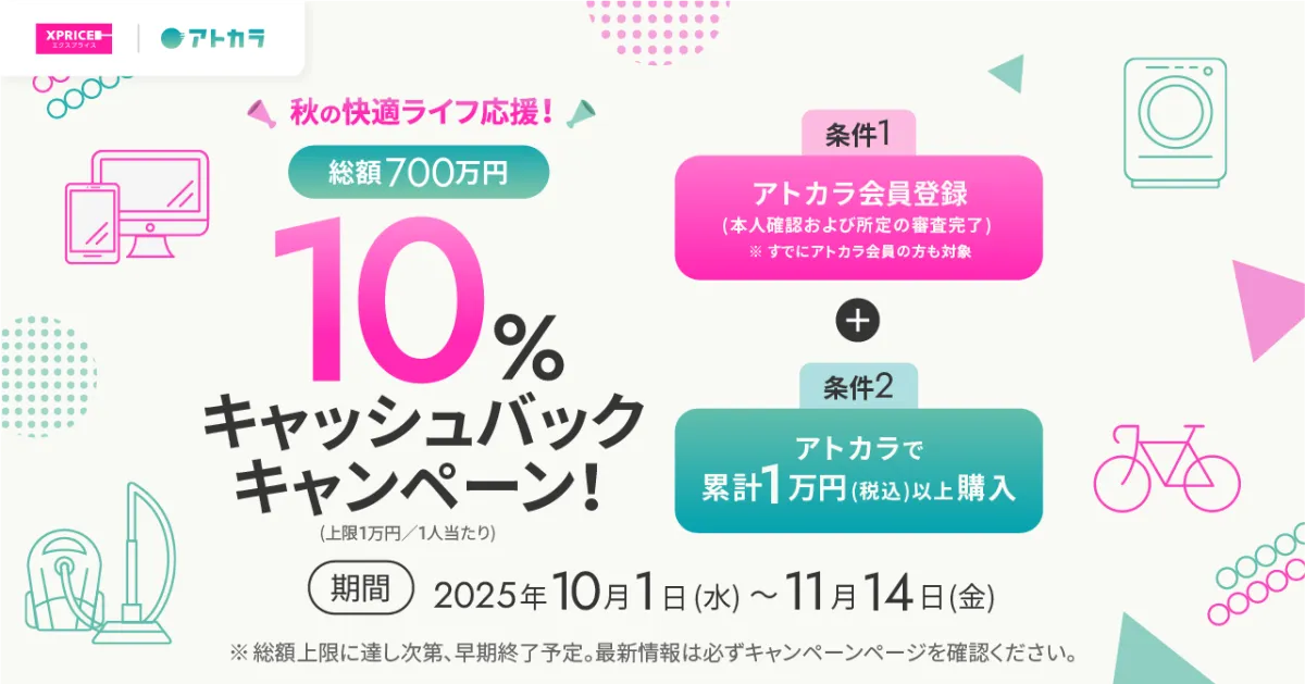 2025年10月1日から、GMOペイメントゲートウェイ株式会社や三井住友カード株式会社が提供する「アトカラ」が、家電ECサイト「XPRICE本店」と提携し、秋の特別キャンペーンを行います。このキャンペーンでは、利用者に対して購入金額の10%をキャッシュバックする嬉しい特典が用意されています。