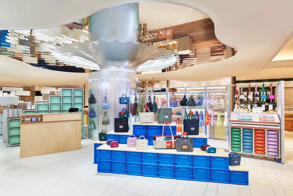 ポップアップ会場では、ビヨンド ザ バインズのデザイン哲学を体現した空間が広がります。軽やかさと温もりを感じるダイナミックな建築デザインの中には、ブランドを象徴する「BTV-TO-GO」コレクションがラインナップされたモジュールウォールが設置されています。さらに、ステンレス素材で作られたストーリ―ウォールは、コレクションの進化を表現するために動くトラックディスプレイを備え、印象的なロゴとともにミントやブルーのアクセントカラーが来場者の目を引く演出がなされています。