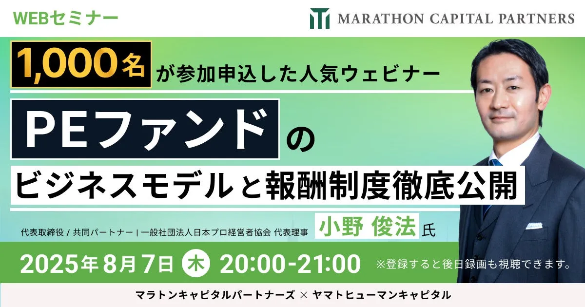 2025年8月7日(木)の20:00から、ヤマトヒューマンキャピタル株式会社が主催するオンラインセミナー『PEファンドのビジネスモデルと報酬制度徹底公開』が開催されます。このセミナーでは、マラトンキャピタルパートナーズの代表であり、一般社団法人日本プロ経営者協会の代表理事でもある小野俊法氏が登壇し、これまで多くの人に知られていなかったPEファンド業界の実情について徹底解説します。