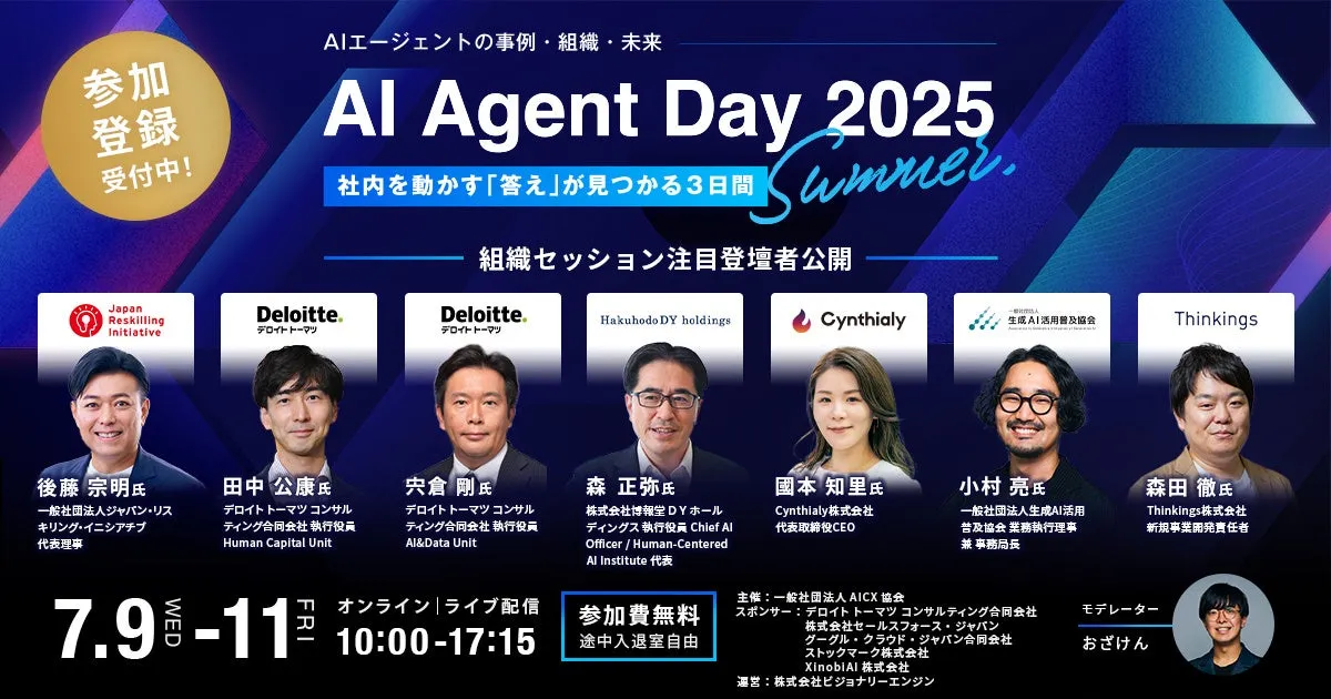 2025年7月9日から11日まで開催される「AI Agent Day 2025 Summer」は、生成AIの導入をテーマにした最も注目すべきカンファレンスです。主催するのは一般社団法人AICX(AI Customer Experience)協会で、今年のイベントでは特に人と組織の変革に焦点が当てられています。参加者は、リスキリングや採用支援、組織開発に関する専門家たちによる9つのセッションを通じて、生成AI時代の新たな戦略を学ぶ機会を得ます。
