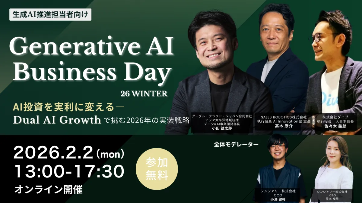 2026年2月2日(月)、法人向けの生成AI人材育成および導入の支援事業を行うシンシアリー株式会社が、オンラインカンファレンス「Generative AI Business Day 26 WINTER」を開催します。このイベントでは、企業の生成AI推進者を対象に、高度な意思決定を可能にする「AIと働く人」の育成と、自律的に業務を処理できる「AIが働く業務」の構築をテーマとし、2026年に向けた戦略的な展望を提示します。