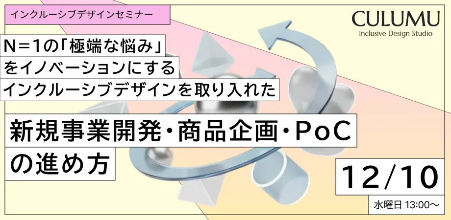 インクルーシブデザインスタジオであるCULUMUは、多種多様な背景を持つ人々と共に創造するプロセスを重視している。セミナーでは、実際のビジネス開発におけるインクルーシブデザインの手法が紹介され、「どうやって適切な当事者を見つけるのか」や「単なる意見聴取ではなく、共に創るワークショップの設計」についても具体例を交えて解説される。特に、参加者が明日から使えるプロセスを学べる貴重な機会となっている。