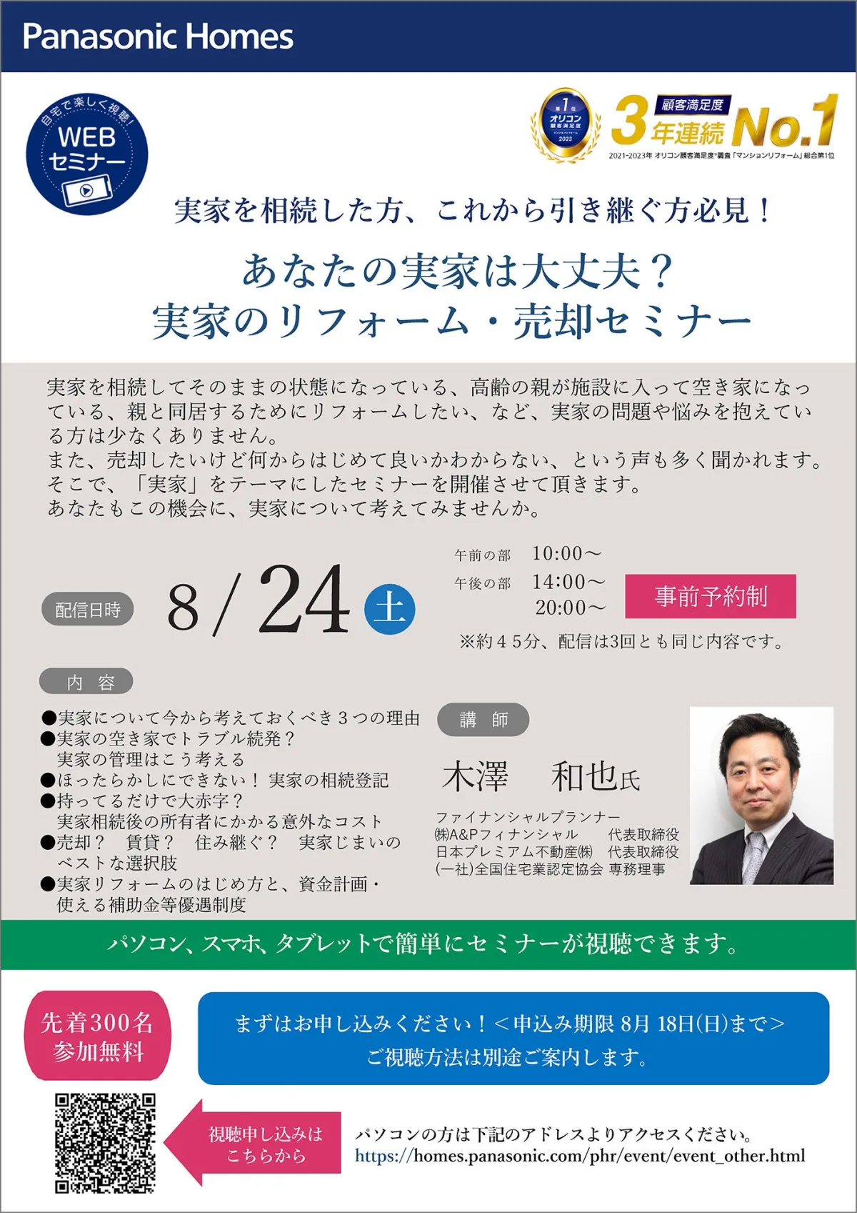 この問題を解決すべく、パナソニック リフォーム株式会社が主催するWEBセミナー『あなたの実家は大丈夫?実家のリフォーム・売却』が、2023年8月24日に開催されます。このセミナーでは、ファイナンシャルプランナーの木澤和也氏を講師として招き、実家相続に必要な知識や対策について詳細に解説します。
