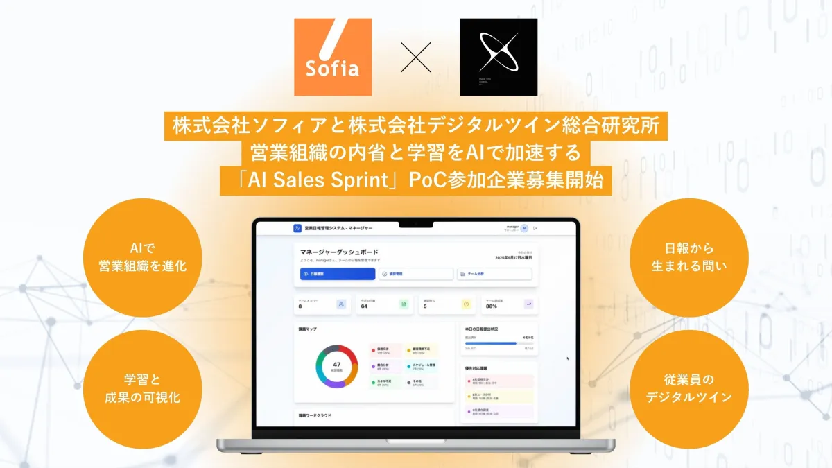 営業組織の効率を高め、成果を確実に上げるための新しい潮流が誕生しました。株式会社ソフィアと株式会社デジタルツイン総合研究所は、営業支援を目的とした新たなAIクラウドサービス「AI Sales Sprint」の共同開発を発表し、今春より「PoC(Proof of Concept)参加企業」の募集を開始しました。