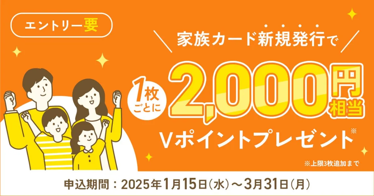 三井住友カード株式会社から、家族カード追加キャンペーンのお知らせです。2025年1月15日から3月31日までの期間中、対象カードでエントリーの上、家族カードを追加するだけで、最大6,000円相当のVポイントをプレゼントします。この機会に、家族カードの魅力を再確認し、賢くお得にご利用ください!
