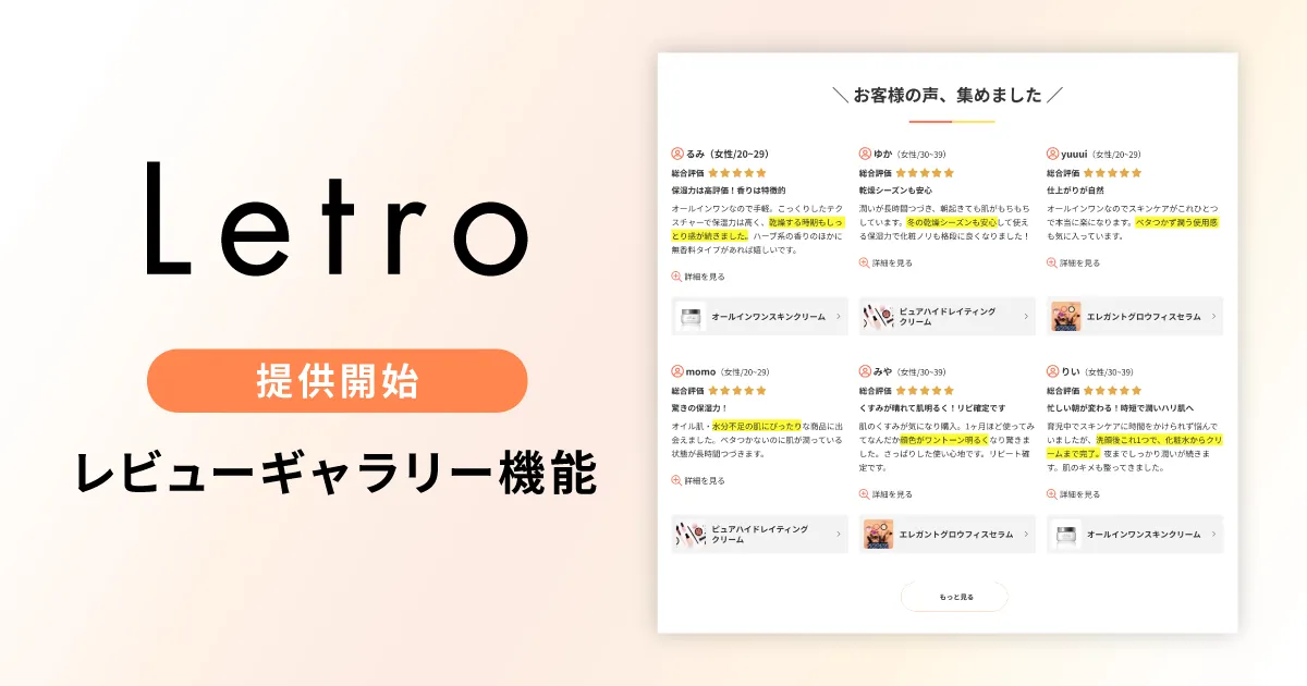 アライドアーキテクツ株式会社が展開するCVR最適化プラットフォーム「Letro」が、ECサイト向けに新機能「レビューギャラリー機能」を導入した。この機能により、ECサイトのトップページや「お客様の声」ページで、複数の商品レビューをまとめて表示できるようになった。
