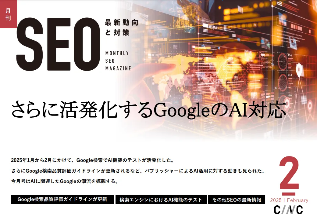 株式会社CINCは毎月、SEOに関する最新情報を発信する「月刊SEO」を発行しています。2月号では、最近の重要な動向や推奨される対策について詳しく紹介されています。SEO担当者やマーケティング関係者には非常に重要な内容となっています。