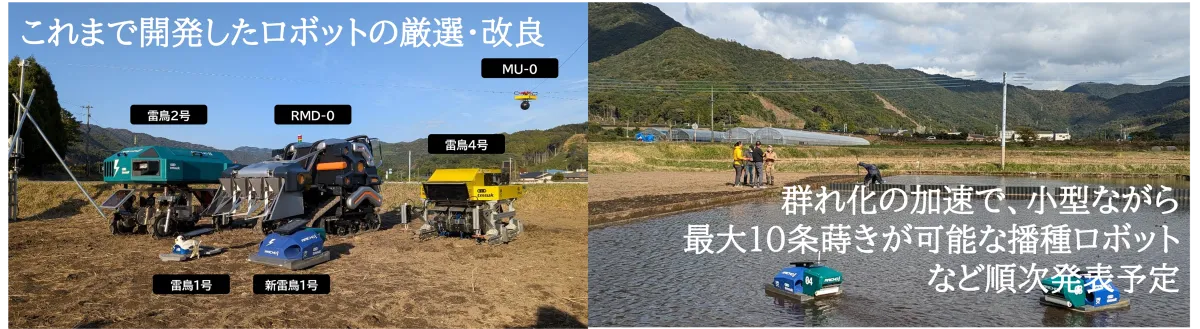WORKROID農業第1章での経験をもとに、寄せられたフィードバックを反映させることによって、新たなロボットの機能を強化し、生産性の向上を図る予定です。特に新たに導入される群れ型播種ロボットは、水面を航行しながら直線的に播種を行うため、より効率的な作業が期待されます。