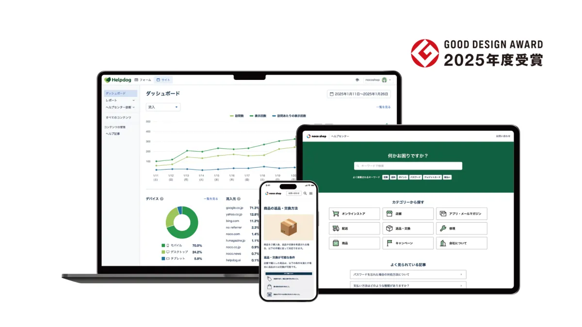 2025年度のグッドデザイン賞を受賞したセルフサポートシステム「ヘルプドッグ」。この受賞は、質問への迅速な回答を提供し、企業のサポート負担を大幅に軽減するデザインが評価された結果です。