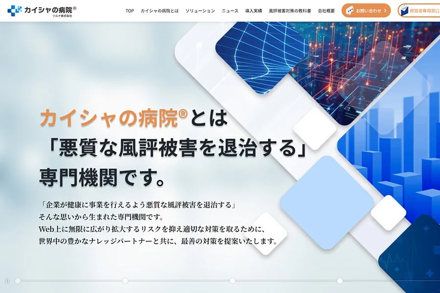恵まれた知識や経験を持つソルナ株式会社(東京都中央区、代表取締役:安宅祐樹)は、創業時から「会社の病院®」のコンセプトを掲げています。このコンセプトのもと、風評や誹謗中傷に関する支援を行っており、発生前の予防医療から、発生後の対処までの一貫した体制を構築してきました。