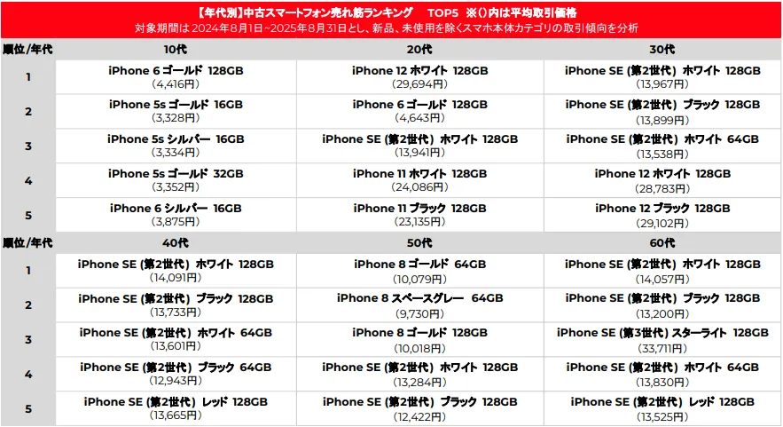 近年注目されているのは、2020年以前に発売されたスマートフォンの数々です。特に30代以上の世代では、iPhone SE(第二世代)が圧倒的な人気を誇り、10代ではレトロな印象のiPhone 5やiPhone 6が上位にランクインしています。これは、インフルエンサーによるSNS投稿が影響を与えていると言われており、エモい写真が受け入れられている背景があります。