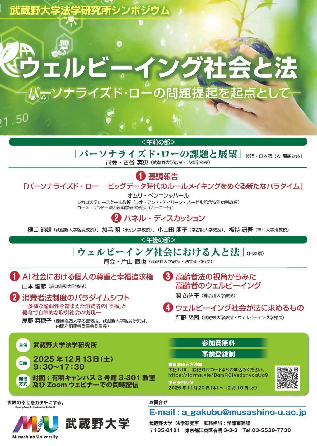 2025年12月13日、武蔵野大学法学研究所は「ウェルビーイング社会と法―パーソナライズド・ローの問題提起を起点として―」をテーマにしたシンポジウムを開催します。このイベントは、東京都江東区の有明キャンパスにて、9時30分から17時30分まで行われます。また、Zoomウェビナーによる同時配信も行われ、参加者は事前登録が必要ですが、参加費は無料です。