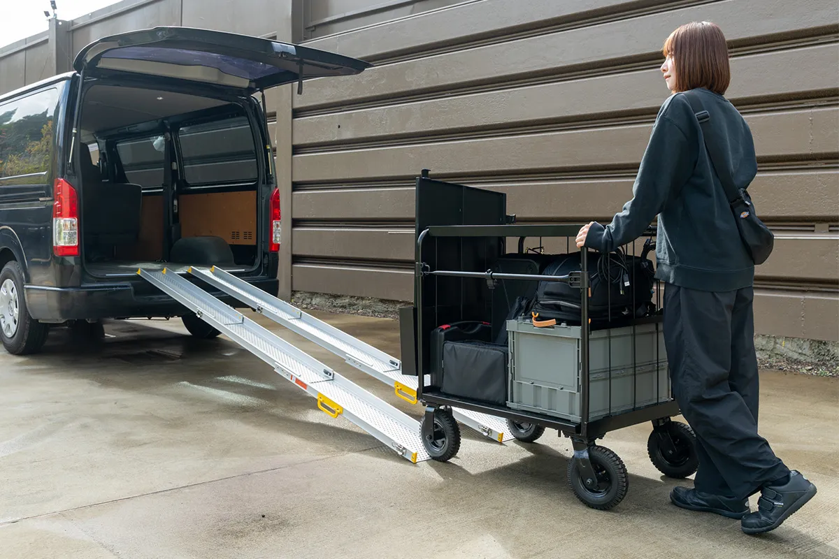 また、機材を守るための棚板「プレミアムシェルフ」と、アクセサリーボックスも備えており、小物の整理や作業効率の向上が図られています。さらに、専用の伸縮式スロープを利用することで、機材を載せたままスムーズに積み込むことができます。このスロープは、展開時に全長が3mとなるため、積載時の角度が緩やかになり、搬入の際の負担が圧倒的に軽減されます。