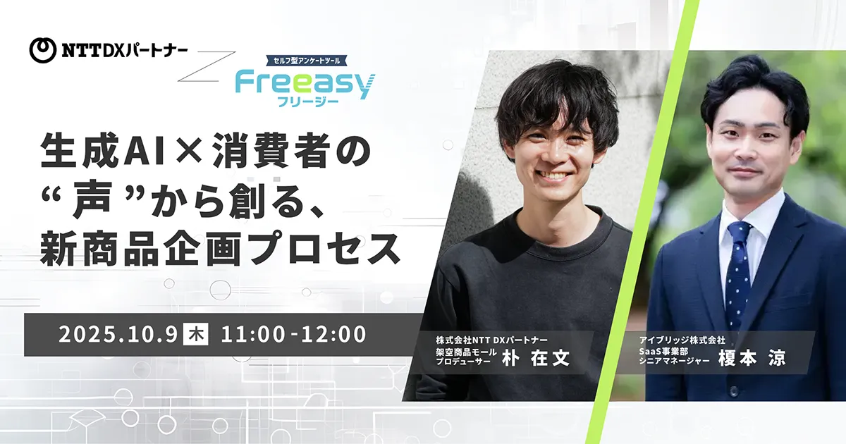 消費者のニーズを素早く捉え、新しい商品を生み出すことは、現代のビジネスにおいて非常に重要な課題です。この度、国内最大級のセルフ型アンケートツール「Freeasy」を提供するアイブリッジ株式会社は、2025年10月9日(木)に「Freeasy×NTT DXパートナー共催オンラインセミナー」を開催します。