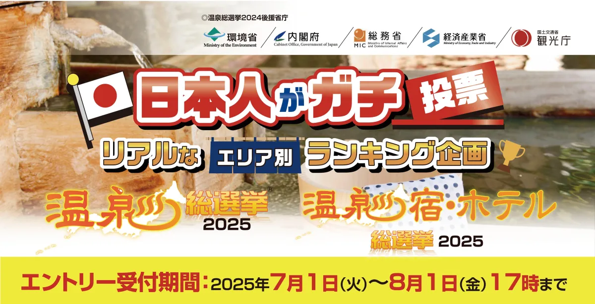 温泉業界にとって嬉しいニュースが舞い込みました。今年で開始から10年を迎える「温泉総選挙2025」と、その姉妹プロジェクトである「温泉宿・ホテル総選挙2025」が、2025年7月1日(火)10時からエントリーを受け付けることになりました。本企画は、環境省や内閣府、経済産業省、観光庁など5つの省庁が後援しています。