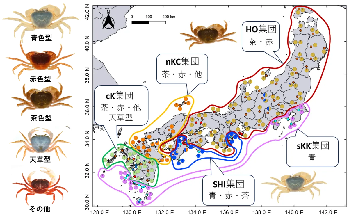 この研究によって、サワガニは5つの明瞭な遺伝的集団に分かれていることが分かりました。特に各集団は、地質や海面変動などの影響を受け複雑な分布パターンを示しており、一部では島をまたいだ分布や飛び地状の分布が見られます。また、同じ体色タイプに見える個体でも、遺伝的には異なる集団に属することが多々あることも判明しました。