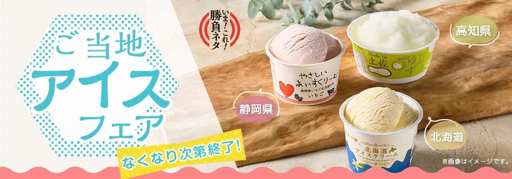 「ご当地アイスフェア」では、北海道の『よつ葉乳業 北海道バニラアイス』、静岡県の『やさしいあいすくりーむ いちご』、高知県の『高知アイス 柚子シャーベット』の3種類がラインナップされています。