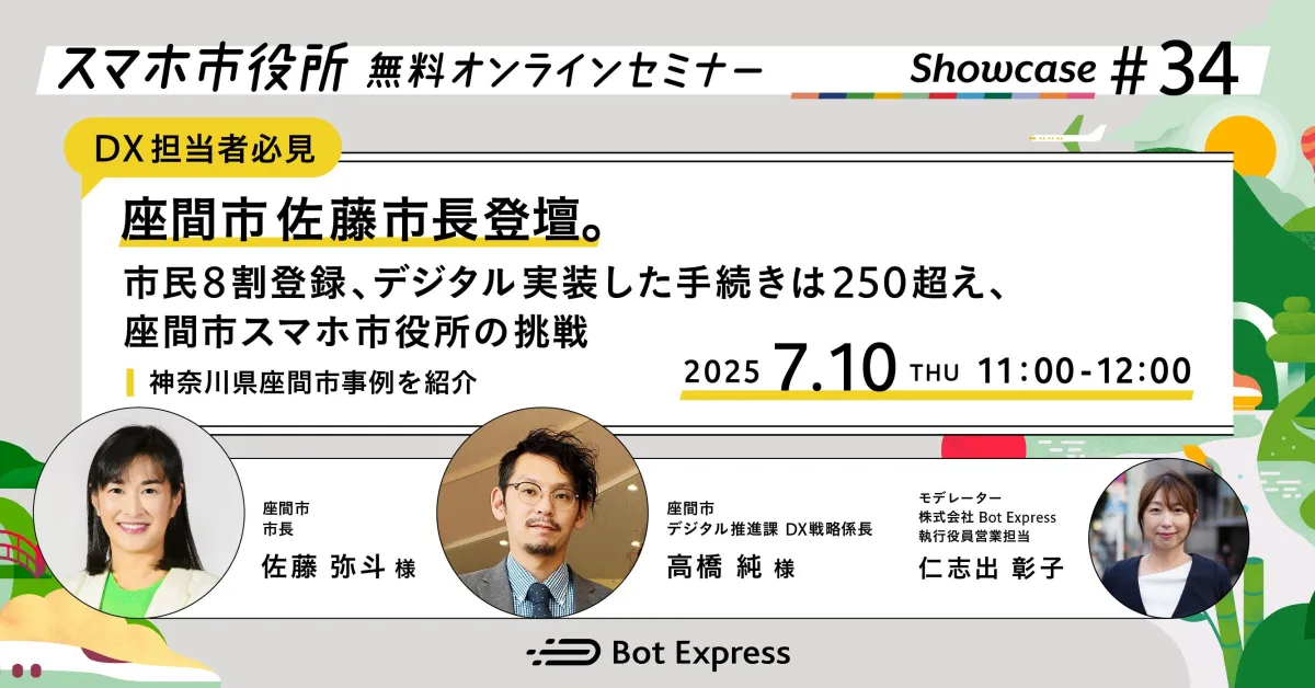 2025年7月10日、座間市の佐藤弥斗市長が登壇し、自市のスマホ市役所プロジェクトについての無料オンラインセミナー「Bot Express Showcase」が開催されます。このセミナーでは、座間市が実現したデジタル化への挑戦や成果を、市長自らが詳しく説明します。